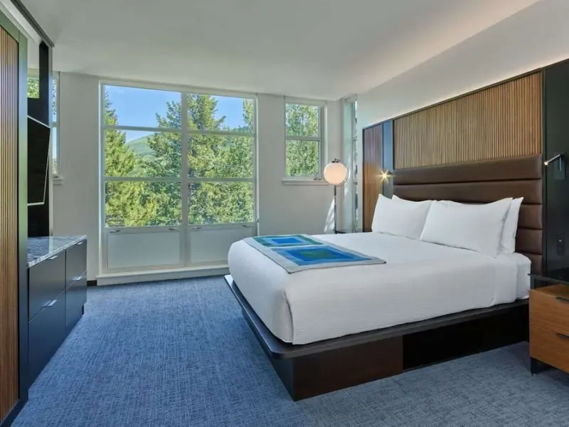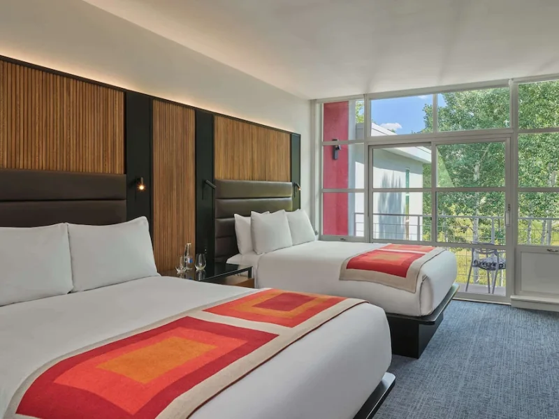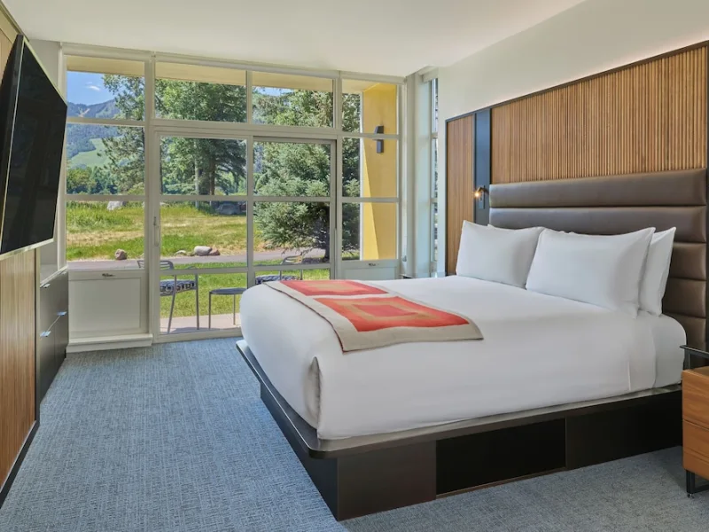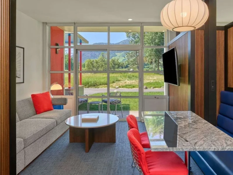 Rooms at Aspen Meadows Resort start at 550 square feet and are inspired by Bauhaus design, featuring gray and white tones with splashes of red. In-room amenities include 42-inch flat-screen TVs, coffee makers, work desks, down pillows and comforters and pillow-top mattresses. Most accommodations have a private balcony or patio. Floor-to-ceiling windows. Rooms have kitchenettes with microwave and refrigerator. Nightly resort fee: $20. Standard room size: 550 square feet. Premium channels. Workspace/desk. Minifridge. Bathrobes/slippers. Shower/tub combo. Internet. Wireless internet. Free internet. Guest rooms with patios and balconies. Adjoining rooms available.