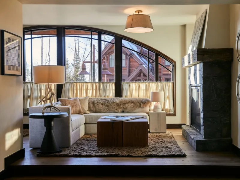 Guest rooms at Madeline Hotel & Residences, Auberge Resorts Collection are decorated with a mix of urban loft decor and alpine design. Accommodations feature dark leather tufted chairs and neutral-hued linen tufted chairs. Bathroom amenities include double vanities, separate showers and soaking tubs. A daily resort fee covers complimentary fitness classes, internet access and access to a PressReader subscription, among other amenities. Nightly resort fee: $50. Standard room size: 510 square feet. Additional features include premium channels, workspace/desk, separate shower, separate tub, internet, wireless internet, free internet, guest rooms with patios and balconies, and adjoining rooms available. Note that some amenities like minifridge, bathrobes/slippers, minibar, and shower/tub combo are not available. For more details on room types, guests can refer to the dedicated section.