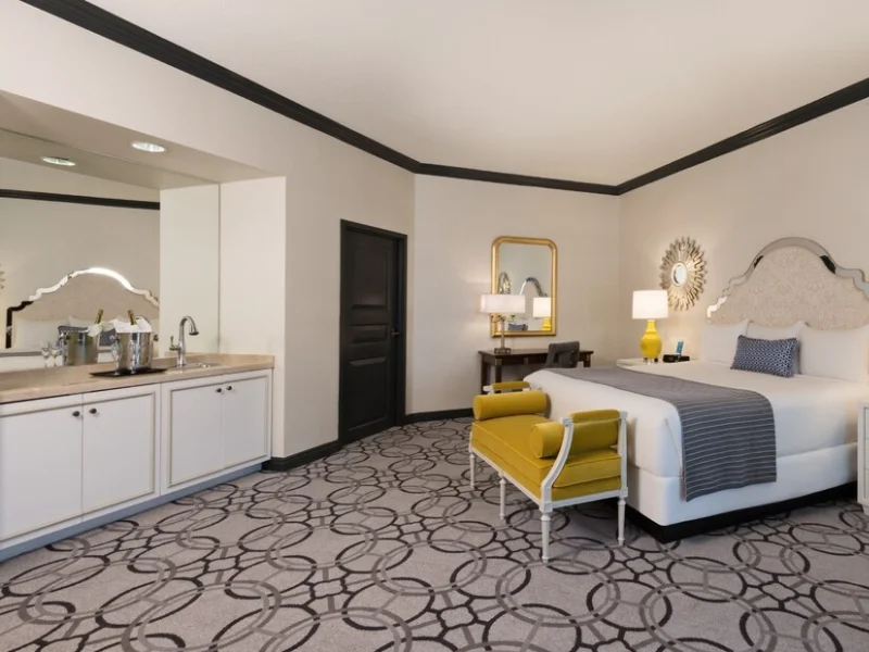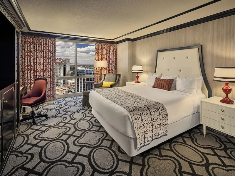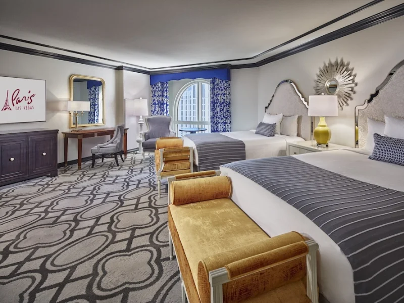 The standard guest rooms at Paris Las Vegas come with either two queen-sized beds or one king-sized bed. Inspired by the French countryside, the rooms are refined in design, with gold tones, wooden decor and marble bathrooms with vine wall paper. Amenities include Gilchrist & Soames bath products, flat-screen TVs, blackout curtains and an in-room safe. Resort fee is $35 per night and includes Wi-Fi access and two fitness center passes per room. Nightly resort fee: $37. Standard room size: 390 square feet. Premium channels, workspace/desk, minifridge, separate shower, separate tub, internet, wireless internet, free internet, adjoining rooms available.