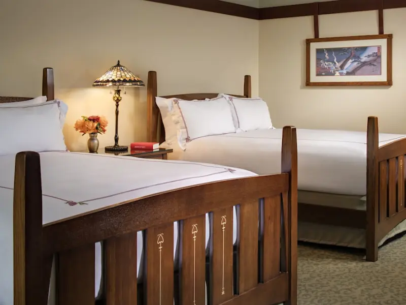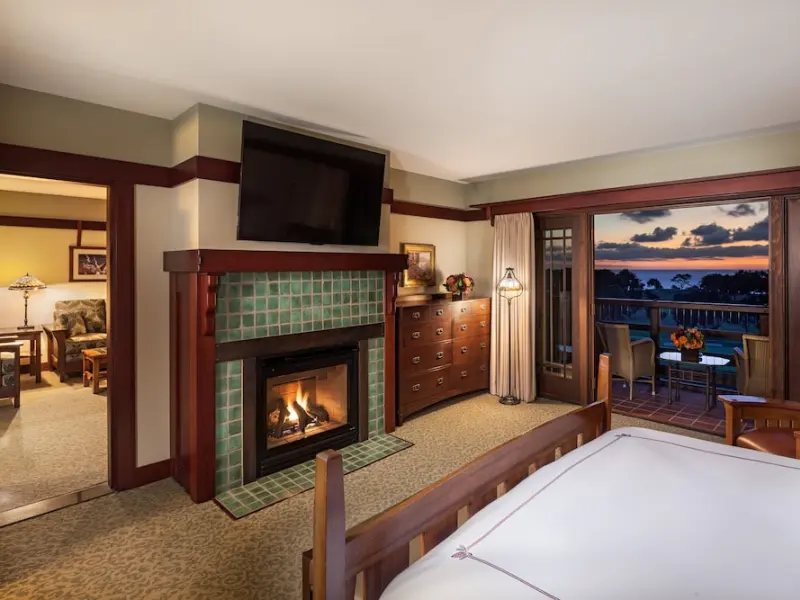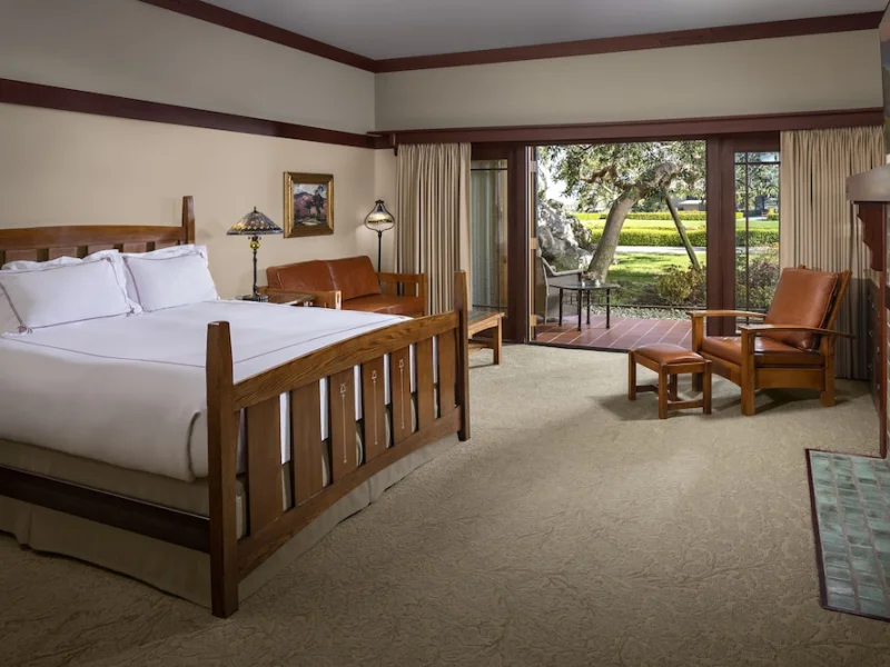 The standard guest rooms at The Lodge at Torrey Pines are the signature rooms, which continue the craftsman theme of the building's exterior with Stickley-style wooden furniture, Tiffany-style lamps and leather upholstery. Balconies and patios overlook the landscaped central courtyard (upgrade for a golf course and ocean view). Bathrooms are granite and marble, with hallway sinks and large tubs. Complimentary Wi-Fi access included in the $40 resort fee. Nightly resort fee: $55. Standard room size: 500 square feet. Premium channels, workspace/desk, bathrobes/slippers, minibar, shower/tub combo, separate shower, separate tub, internet, wireless internet, free internet, guest rooms with patios and balconies, adjoining rooms available.