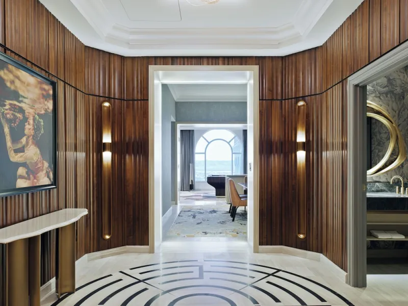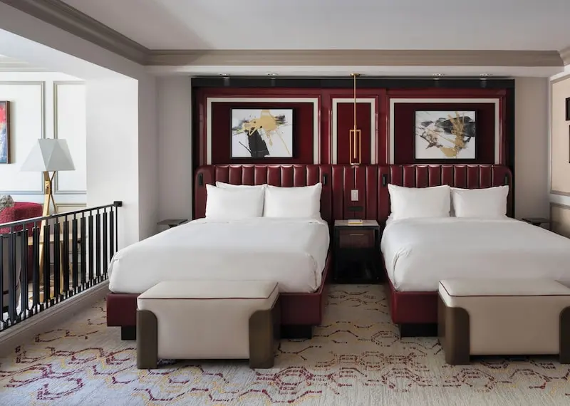 The standard guest rooms are spacious luxury suites, with room for a king-sized bed, a bathroom with dual sinks and a separate living room area with a couch, two cushioned chairs and a dining table for three. Amenities include a remote that controls shades and curtains, a private water closet with a telephone, an iHome alarm clock and an in-suite safe. Nightly resort fee: $50 plus tax. Standard room size: 650 square feet. Featured amenities include premium channels, workspace/desk, minifridge, minibar, separate shower, separate tub, internet, wireless internet, free internet, adjoining rooms available. Some features like bathrobes/slippers, shower/tub combo, fee for internet usage, and guest rooms with patios and balconies are not available.