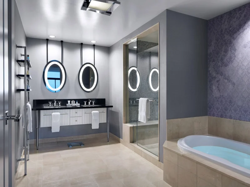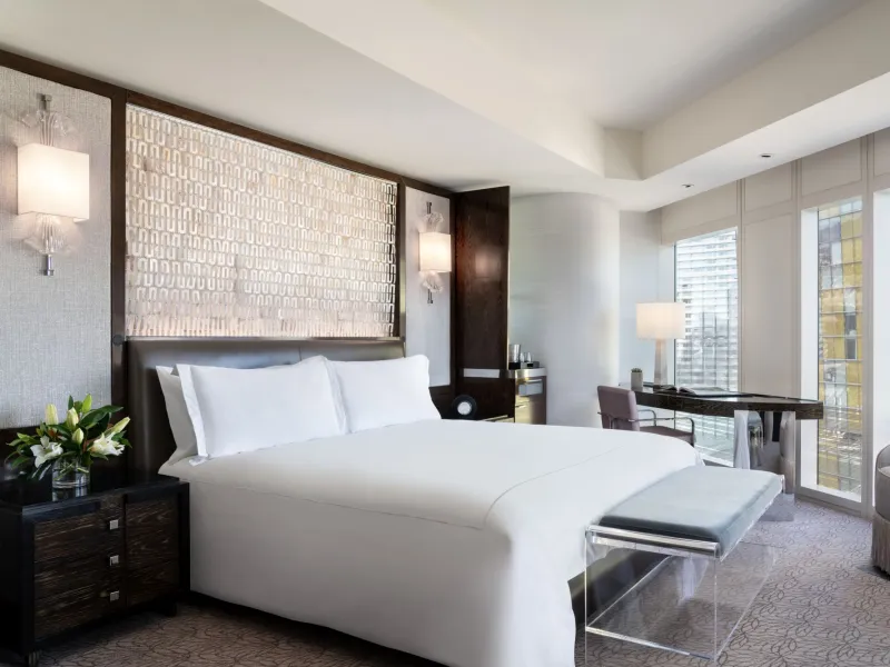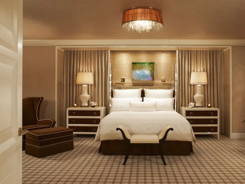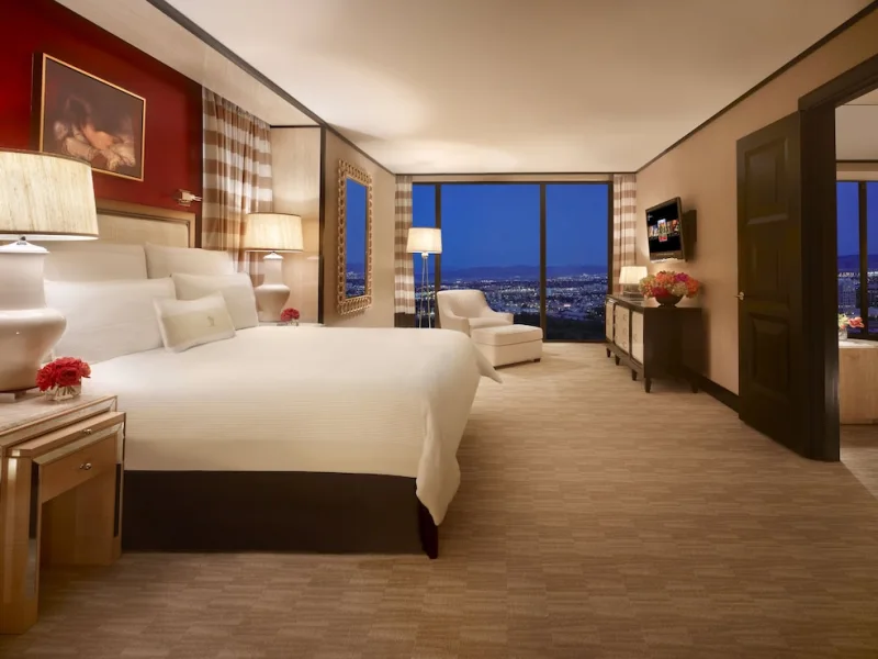 This sprawling resort – with its huge emphasis on natural light, greenery and other earthy elements – is perhaps the first central Las Vegas hotel to master the feeling of seclusion rather than themed chaos. The rooms here are no different. Standard rooms are large (starting at more than 600 square feet) and incredibly elegant. Not only are accommodations dressed in a warm tan and cream color palette, but they come outfitted with luxurious amenities, such as 55-inch flat-screen TVs, deep soaking tubs and floor-to-ceiling windows that offer incredible views of the city and its mountains. Outside of the rooms, you'll find a bevy of restaurant options and the posh casino, to name a few of the many things offered. Do know that you'll pay a pretty penny for everything here (and a daily resort fee on top of that), although most visitors say it's worth it the splurge. The Wynn enjoys a centralized location with Encore, The Palazzo and The Venetian all within walking distance.