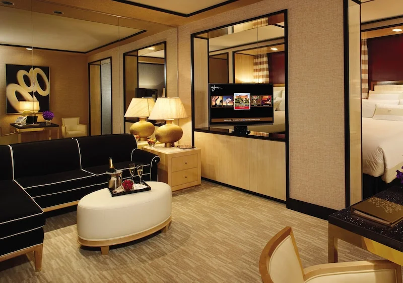 The Wynn's spacious guest rooms start at 640 square feet and have views of either the Strip or valley. Accommodations feature large flat-screen TVs, complimentary Wi-Fi access and a touch screen device that allows guests to control the curtains, lighting and order room service. Bathrooms feature separate soaking tubs and glass showers, plus water closets with small flat-screen TVs. The daily resort fee includes in-room Wi-Fi access. Nightly resort fee: $50. Standard room size: 640 square feet. Premium channels, workspace/desk, bathrobes/slippers, minibar, separate shower, separate tub, internet, wireless internet, free internet.